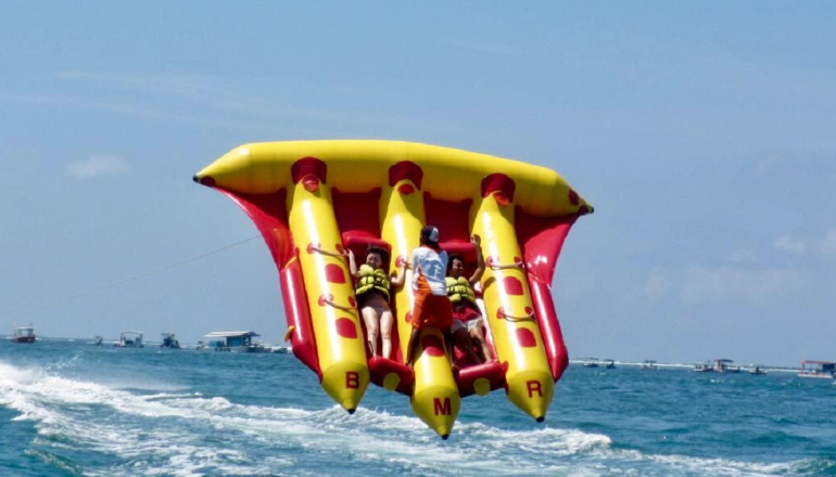 Flying Fish ride at Tanjung Benoa, be prepared for an extraordinary sensation. As you grip the rope on this fish-like rubber boat, you’re ready to soar into the sky, signifying the start of your water sports adventure in Bali.